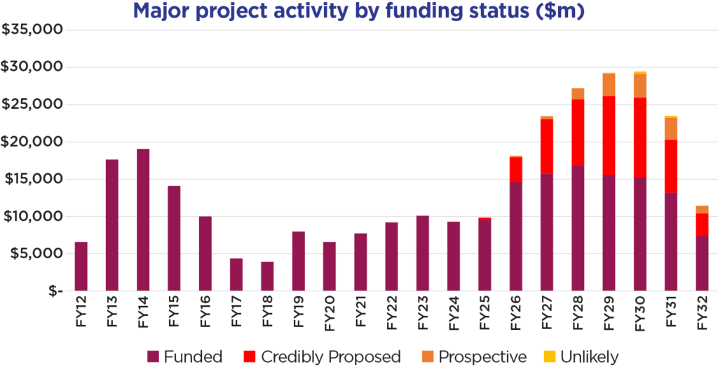 Funded activity peaks in 2027/28 at $16.9b, before moving lower in 2028/29 and 2029/30. However, if all unfunded work proceeds ($10.3b), the total major project activity would surge to $27.2b annually in 2027/28 and then $29.4b in 2029/30, exceeding work levels at the peak of the resources boom in 2012/13 ($19.1b).
